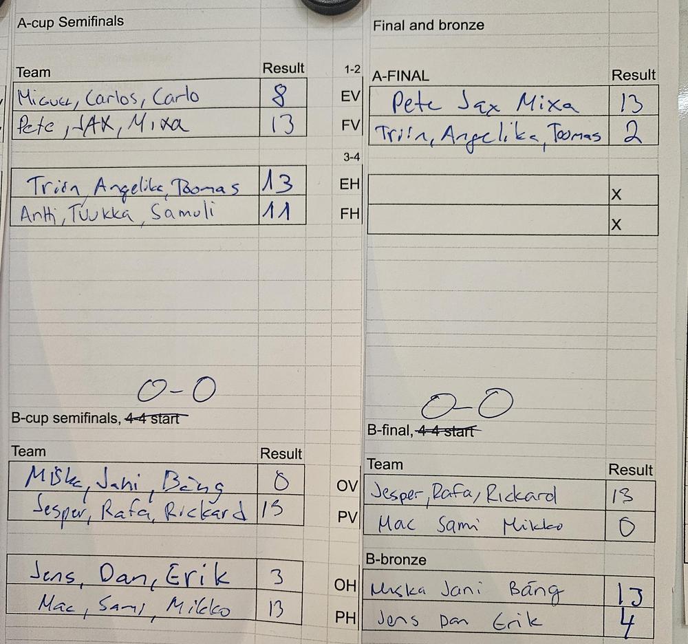 3 SWE: Jens Terestchenko, Dan Backne, Erik Erlandsson (sat evening) | 3 Jarkko Pahkala, Toto Foussier, Antero Lehti (sat morning) |